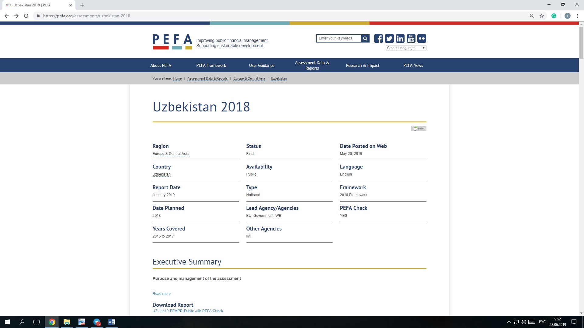 Впервые в истории Узбекистана Секретариат Оценки эффективности государственных расходов и финансовой отчетности (PEFA) опубликовало на своем веб-сайте Отчет об оценке эффективности государственных расходов и финансовой отчетности (PEFA), проведенной в Узбекистане в 2018 году.