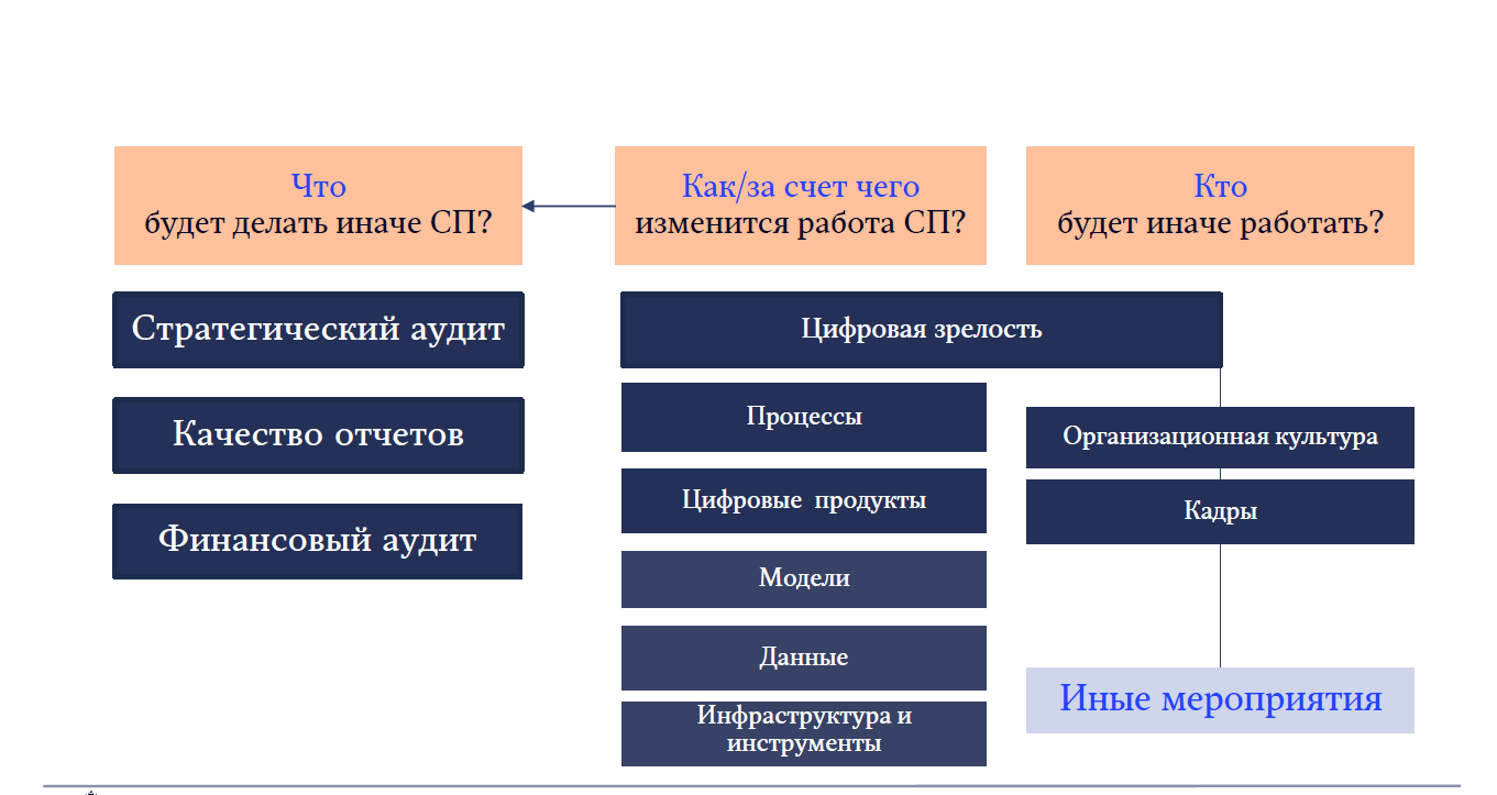 Суть трансформации состоит в плавном переходе «от контроля к стратегическому аудиту» и «от закрытости к открытости и подотчетности». Это, в свою очередь, требует цифровой трансформации, или «цифровой зрелости» Счетной палаты.