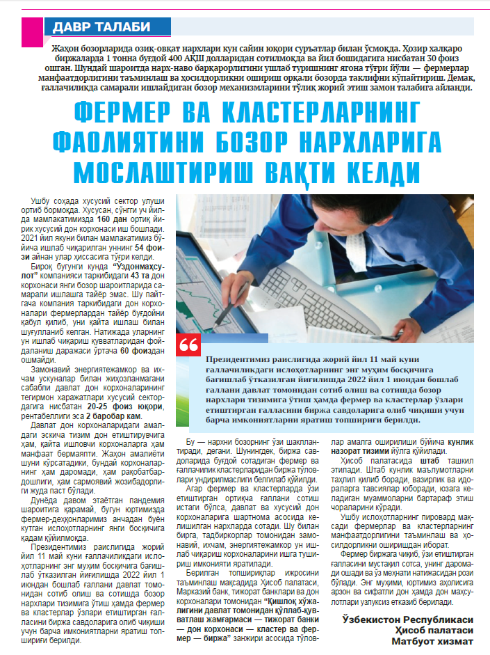 Ғаллачиликда самарали ишлайдиган янги бозор механизмлари Нарх-наво барқарорлиги Фермерлар манфаатдорлиги ва ҳосилдорликни ошириш “Ўздонмаҳсулот” компанияси таркибидаги корхоналарнинг фаолияти Давлат раҳбари бошчилигида ғаллачиликдаги ислоҳотларнинг энг муҳим босқичига ўтиш Ҳисоб палатасининг янги кунлик назорат тизими Ушбу муҳим янгилик ва ўзгаришлар ҳақида "Янги Ўзбекистон" газетасининг № 106 (28.05.2022 й.) сонида ўқишингиз мумкин.