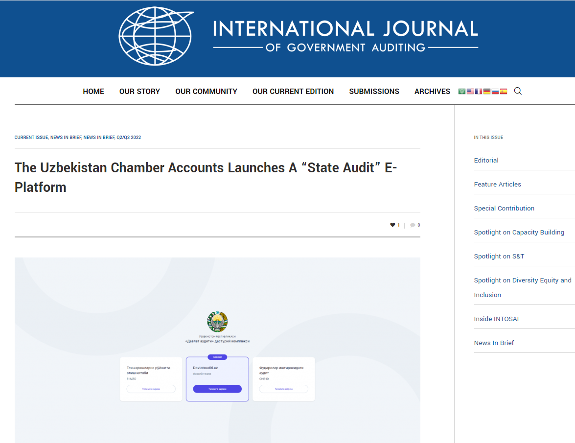 Куни кеча «Давлат аудити» дастурий комплекси ҳақида мақола Олий аудит органларининг халқаро ташкилоти ИНТОСАИ томонидан нашр қилинадиган Давлат аудити халқаро журналининг (International Journal of Government auditing) навбатдаги сонида чоп этилди.