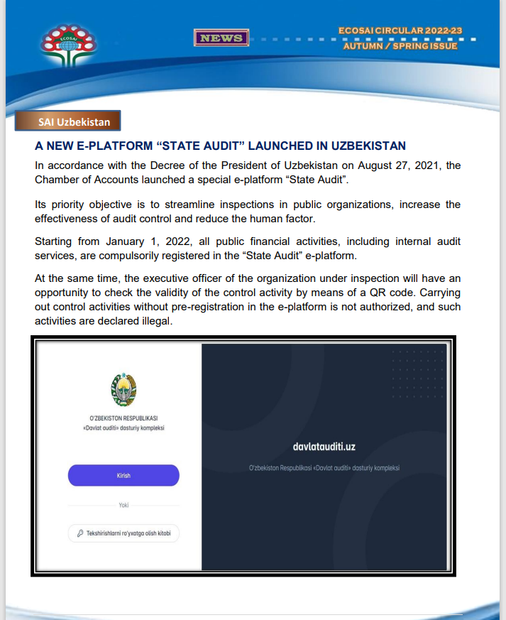 2022 йилнинг июн ойида «Давлат аудити» дастурий комплекси ҳақида маълумот ЕВРОСАИ ташкилотининг Ахборот технологиялари бўйича ишчи гуруҳининг махсус бюллетенида (Эстонияда) нашр қилинган эди.