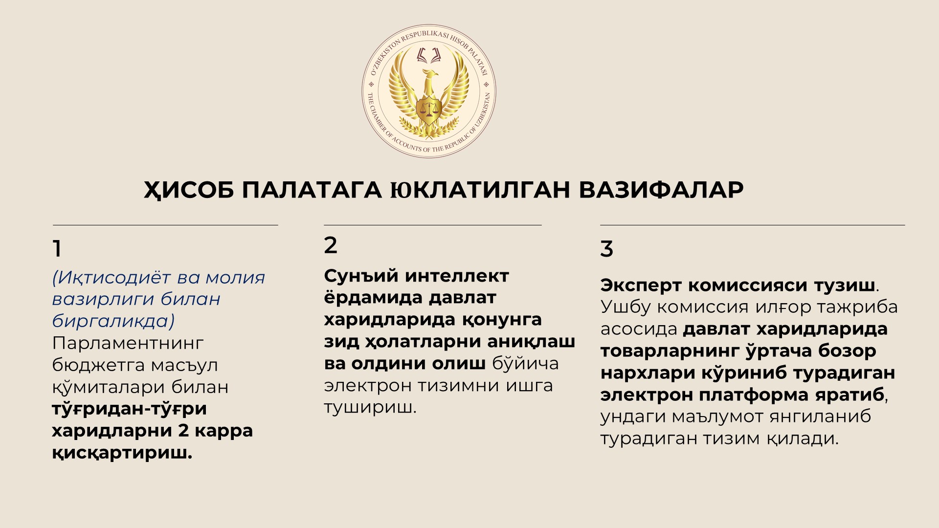 Жумладан, Ҳисоб палатасига (Иқтисодиёт ва молия вазирлиги билан биргаликда) Парламентнинг бюджет учун масъул қўмиталари билан ҳамкорликда тўғридан-тўғри харидларни 2 карра қисқартириш топширилди.